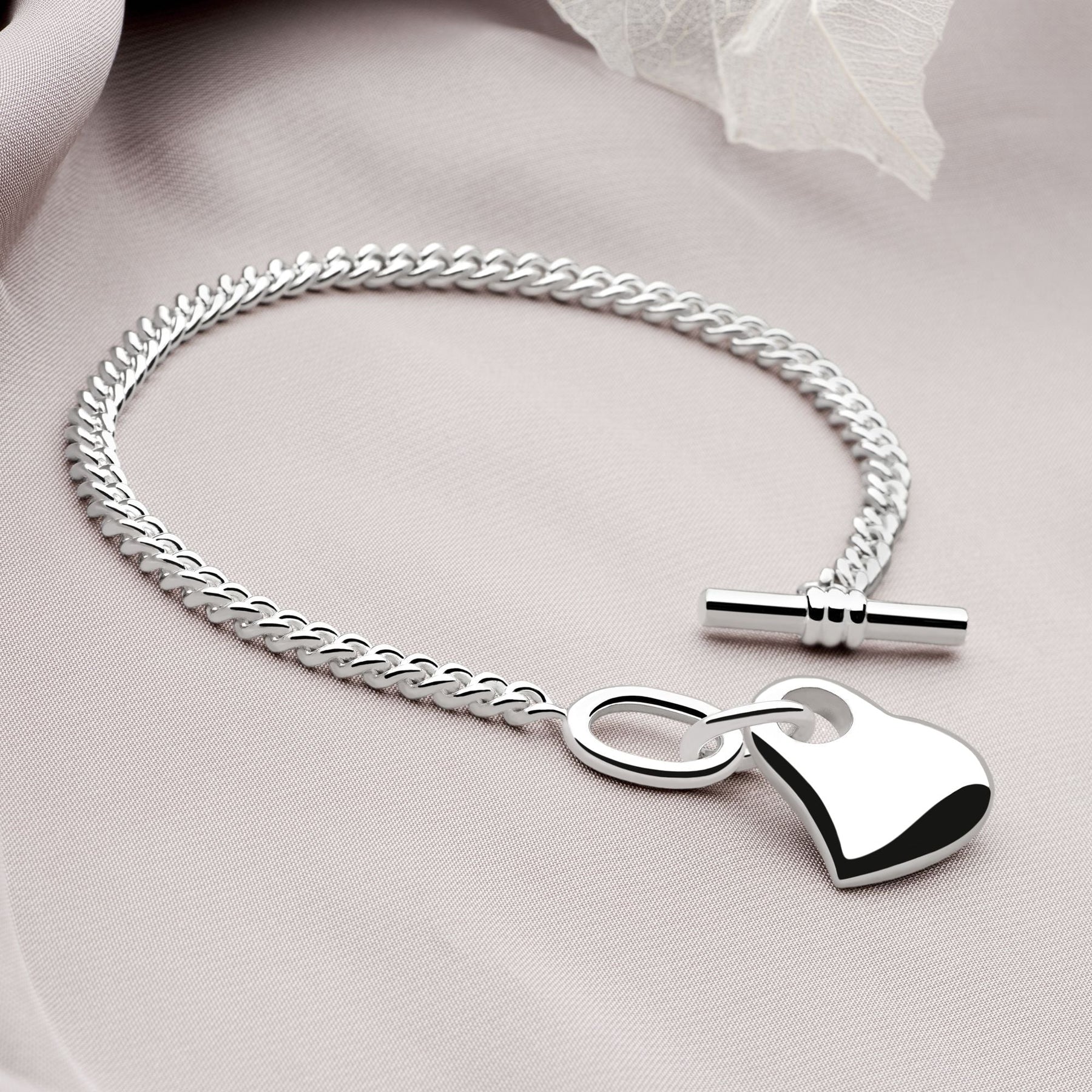With dramatic designer styling, a smooth edged tactile silver heart dangles beautifully from a classic belcher chain with timeless T-bar clasp.