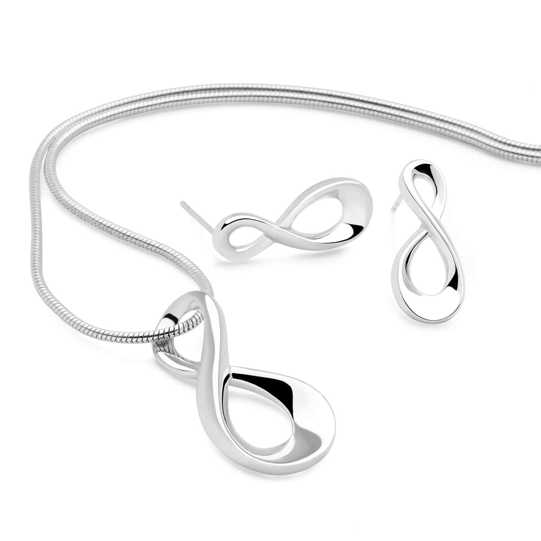 Celebrate your 'infinite love' with this smooth 925 sterling silver pendant. This mesmerising silver infinity pendant & earring set will always look as good as you do.