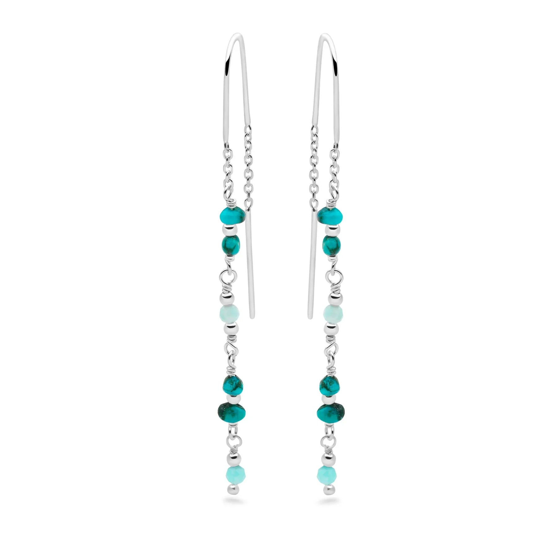 Our delightful Water Fall earrings are bought to life with a combination of silver chains tumbling down a stream of mini turquoise & amazonite beads. Boho chic meets beauty in this quality sterling silver design.